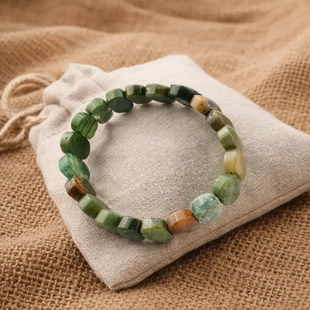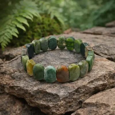 Hint akik taşının doğal ve dengeleyici enerjisiyle hazırlanmış bu özel rolex model doğal taş bileklik, yaklaşık 1 cm x 1,4 cm boyutlarındaki dikdörtgen kesim taşlardan özenle tasarlanmıştır. Yeşil, kahverengi ve toprak tonlarının eşsiz uyumuyla dikkat çeken bu taş, hem estetik hem de güçlü bir görünüm sunar. Günlük kullanımda stilinizi tamamlarken, ruhsal denge ve iç huzur sağlamaya yardımcı olur.